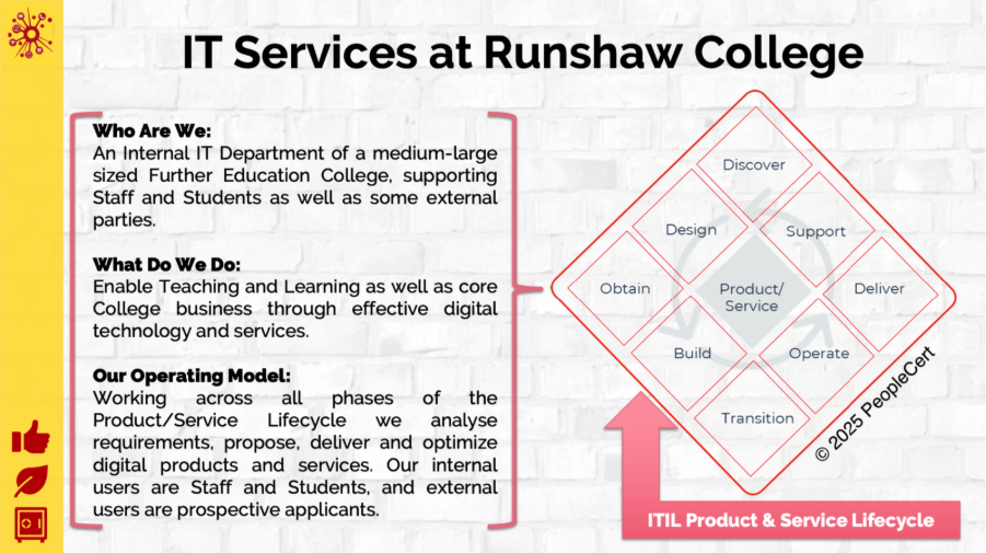 One day, we reframed everything around a fully integrated IT Services function. We didn’t know it yet, but we were working in line with what would become the ITIL digital product and service lifecycle. We used to think in terms of “projects then operations”, but now the lifecycle is a model, a storyline that describes our operation perfectly. We: Discover, Design, Obtain, Build, Transition, Operate, Deliver, and Support . This new way of working quickly brought clarity to ownership, visibility to flow, and a shared language across IT Services. It also aligned perfectly with the direction being championed in ITIL (Version 5), which I’m proud to help launch as a PeopleCert Ambassador.